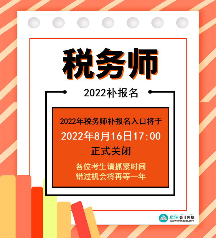 2022年税务师考试补报名入口8月16日17时关闭!想要参加2022年税务师考试的同学请抓紧时间。补报名入口>>