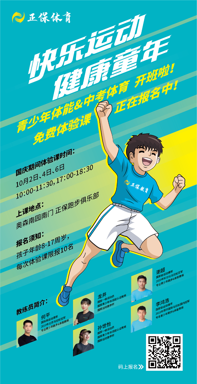 快速提升青少年身体素质,助力中小学体考过关斩将,体育让梦想成真!国庆期间免费体验课时间为10月2日、4日、6日(10:00-11:30;17:00-18:30)。