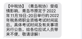 【中税协】(青岛税协)受疫情影响,青岛市原定于2022年11月19日-20日举行的2022年税务师职业资格考试时间延后。具体考试时间及有关事项另行公告。给各位应试人员带来不便,敬请谅解!