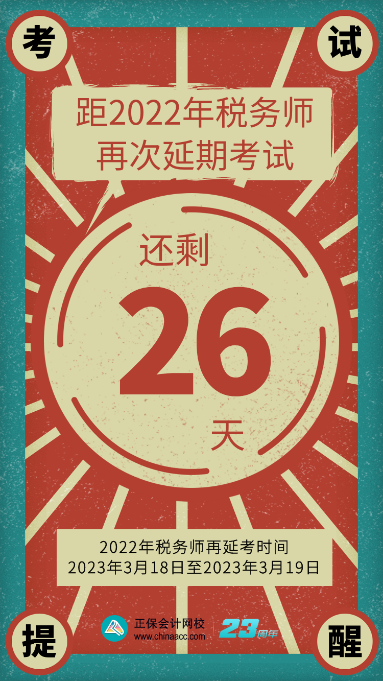 参加2022年税务师再次延期考试的同学请注意,距2022年税务师再次延期考试还剩26天!