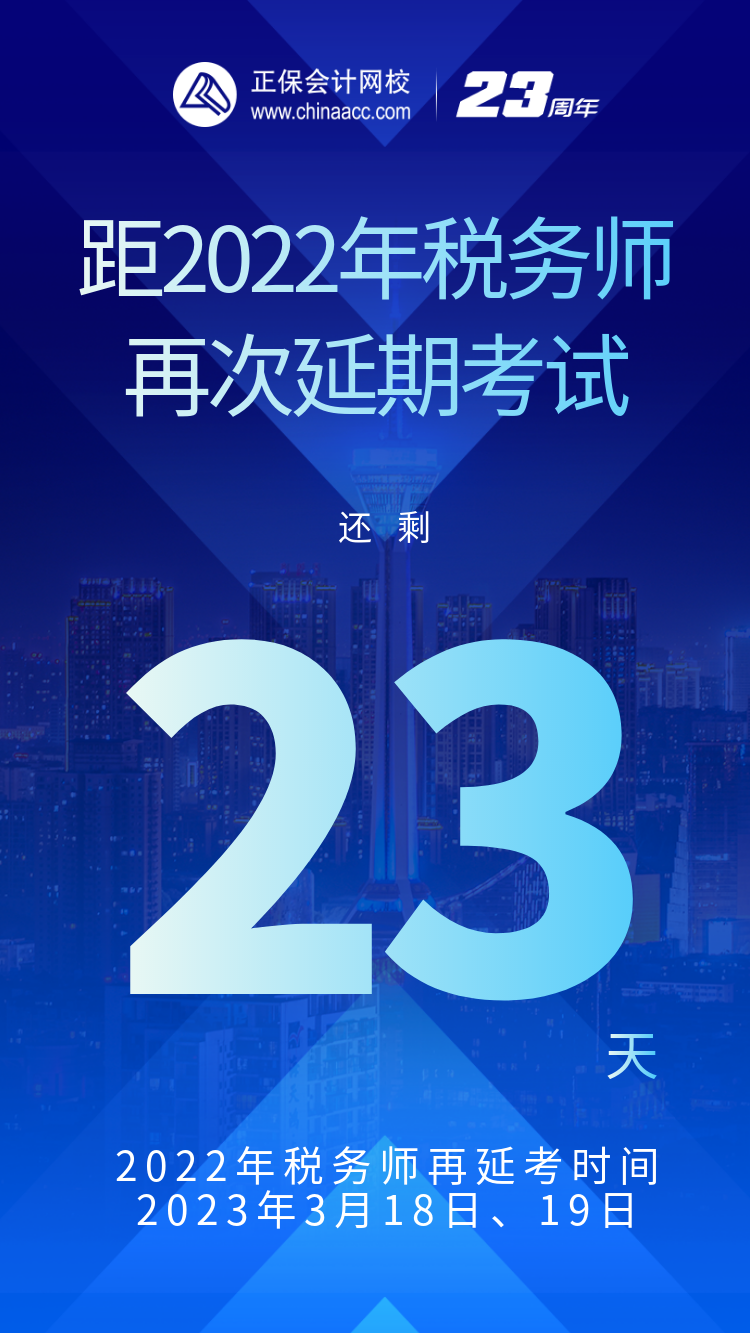 参加2022年税务师再次延期考试的同学请注意,距2022年税务师再次延期考试还剩23天!