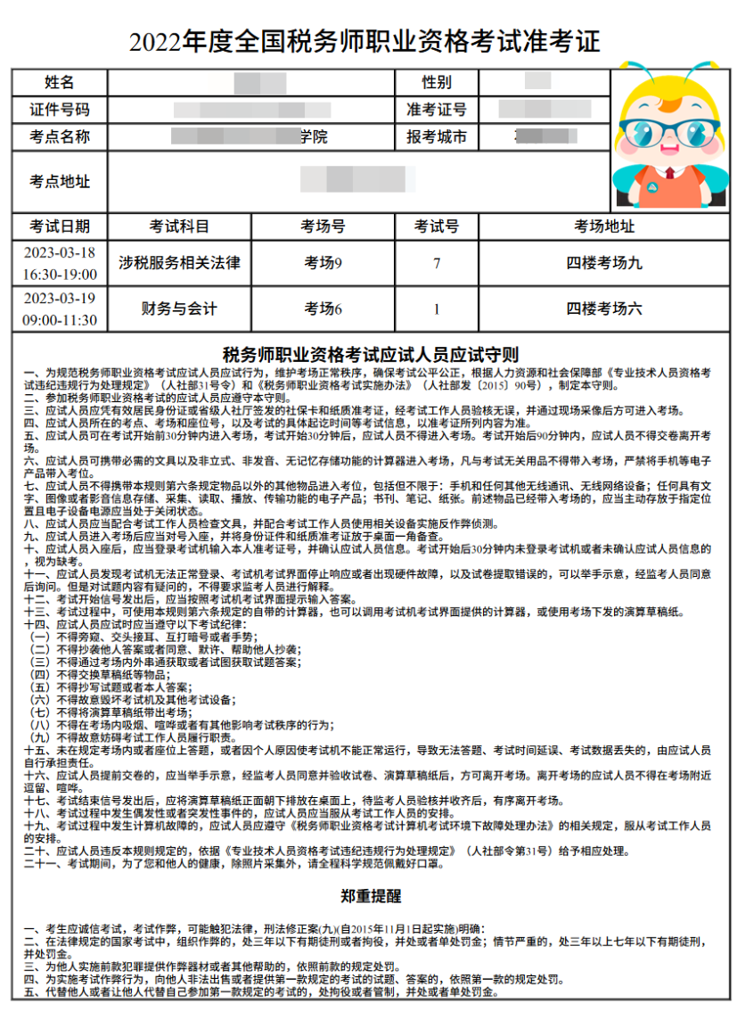 温馨提示:没有准考证不能参加税务师考试!一定要在规定的时间内去打印。建议考生要多打印几份准考证,并保存好以备不时之需。同时,建议考生一定要多备份电子版,并保存在优盘、常用邮箱里面等。以防备纸质版丢失时,可以及时用电子版再打印。