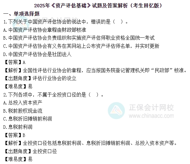2025年资产评估师《资产评估基础》科目考试终于结束啦,同学们考的如何呢?正保会计网校特整理的2025年资产评估师考试试题及参考答案,供大家参考,一起来看看吧。