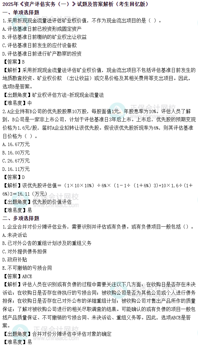 2025年资产评估师《资产评估实务(一)》科目考试终于结束啦,同学们考的如何呢?正保会计网校特整理的2025年资产评估师考试试题及参考答案,供大家参考,一起来看看吧。