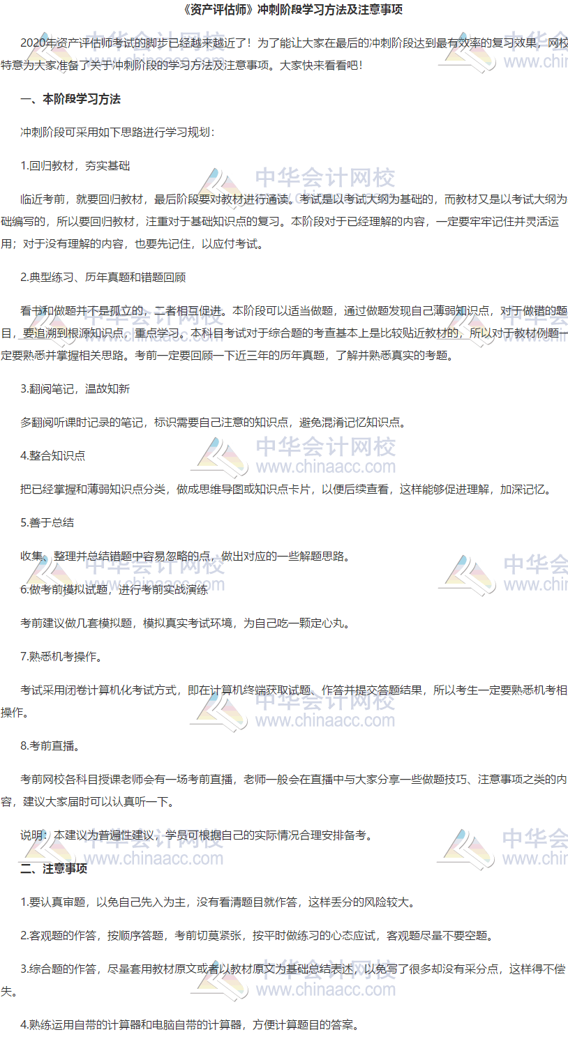 距离2020年资产评估师考试还有30多天的时间,学习备考也已经进入了冲刺阶段了,网校老师为各位学员整理了2020年资产评估师冲刺阶段学习方法及注意事项,一起来看看吧!