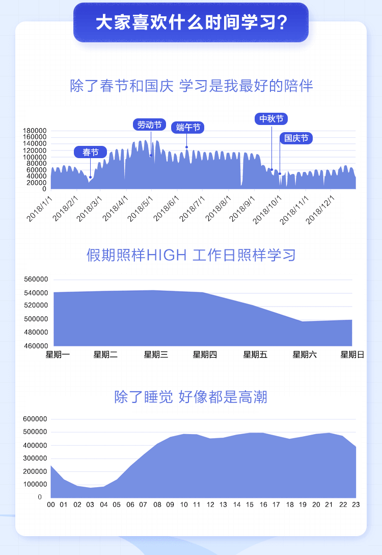 看看网校这些2018年学员的数据,相信你的2019已被自己安排得明明白白。如何选班次?什么学习方式?我们的数据显示网校学员的学习时间,除了睡觉,好像都是高潮哦!大家都在挤时间学习,你是真的挤不出来,还是不想挤?