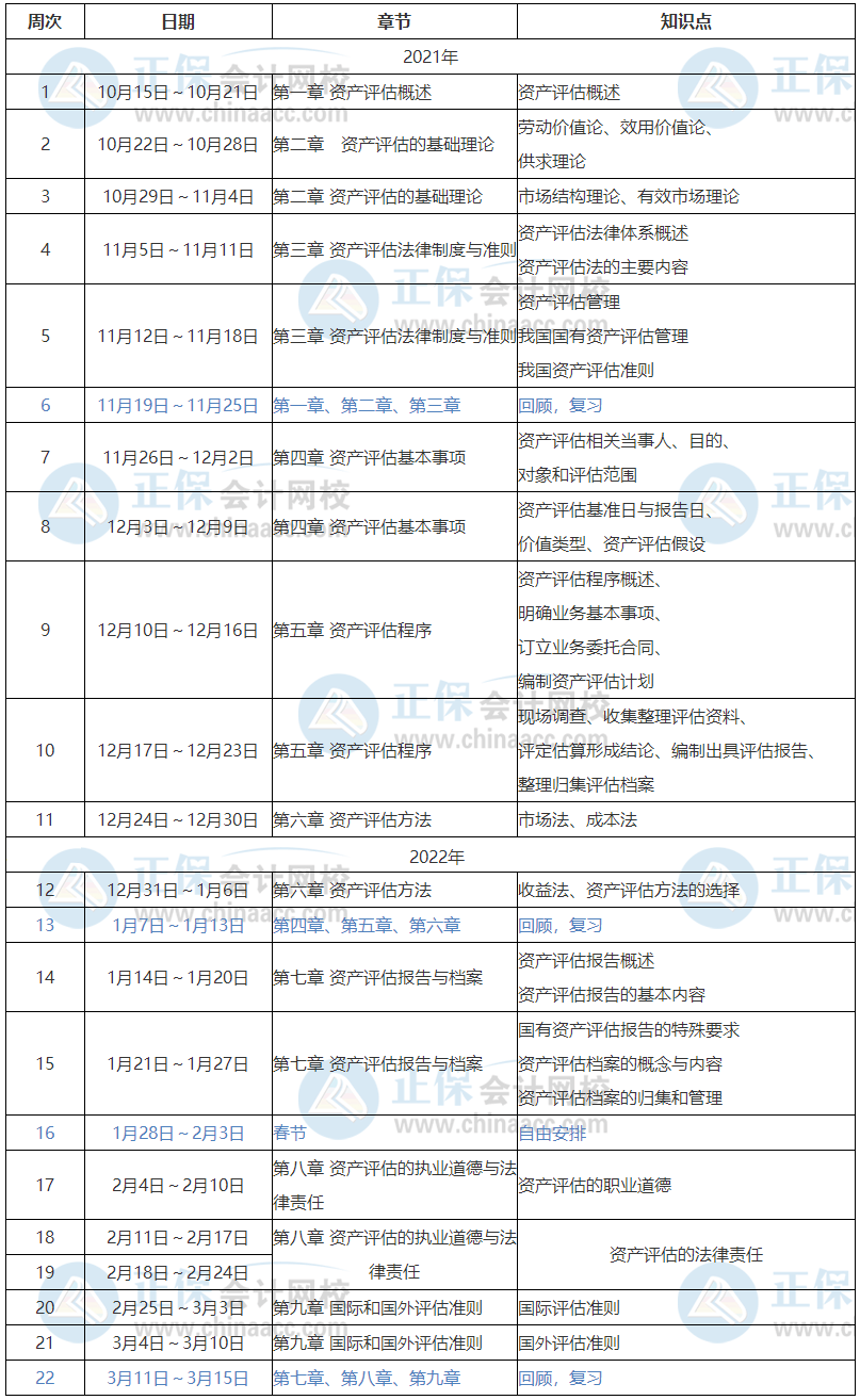 为帮助大家尽快适应《资产评估基础》科目的学习,正保会计网校针对该科目制定了2022年预习计划表,以方便同学们对该科目的预习进度进行整体把握,希望这份计划表对大家顺利通过2022年的考试有所帮助。