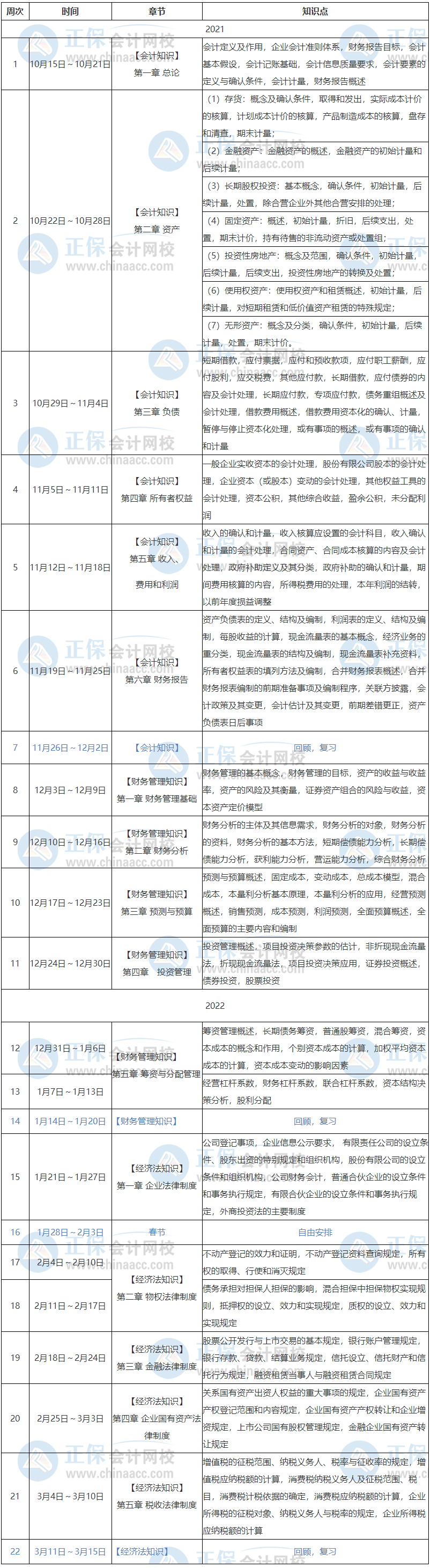 备注:整体进度说明:本计划表从2021年10月15日开始执行,计划于2022年3月15日结束,共计5个月;学员可根据本表的提示,结合自己的时间安排及学习情况进行细化,并按课程要求完成听课、做题的学习任务,基本可满足考试需要。