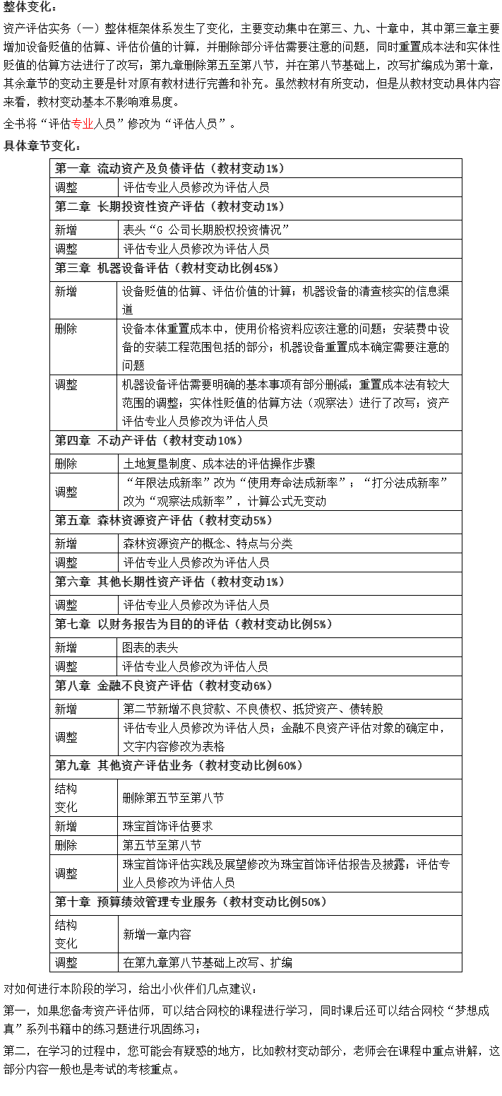 2022年资产评估师考试教材已经下发,想知道今年教材都发生了哪些变化吗?网校教学老师已经为大家整理出来了教材变化,一起来看看: