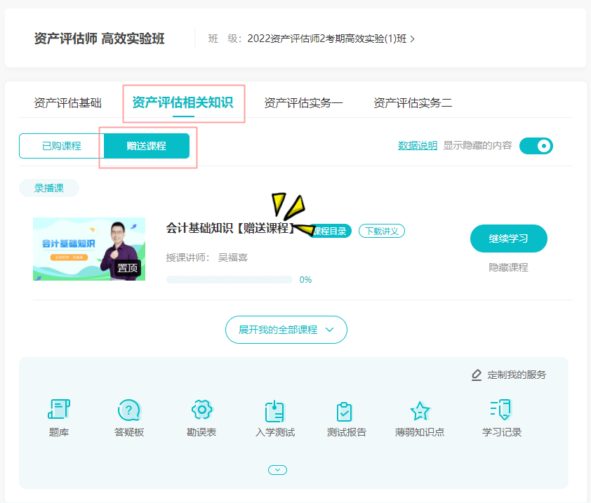 2022年资产评估师高效实验班课程陆续更新中,免费听>更多视频课程可在资产评估师高效实验班学习!还未购课的同学赶紧>