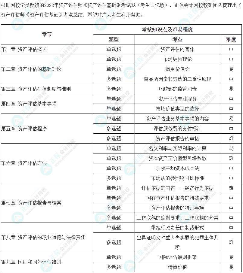 根据网校的学员反馈,正保会计网校教研团队梳理出了2023年资产评估师《资产评估基础》考点总结,希望对广大考生有所帮助。