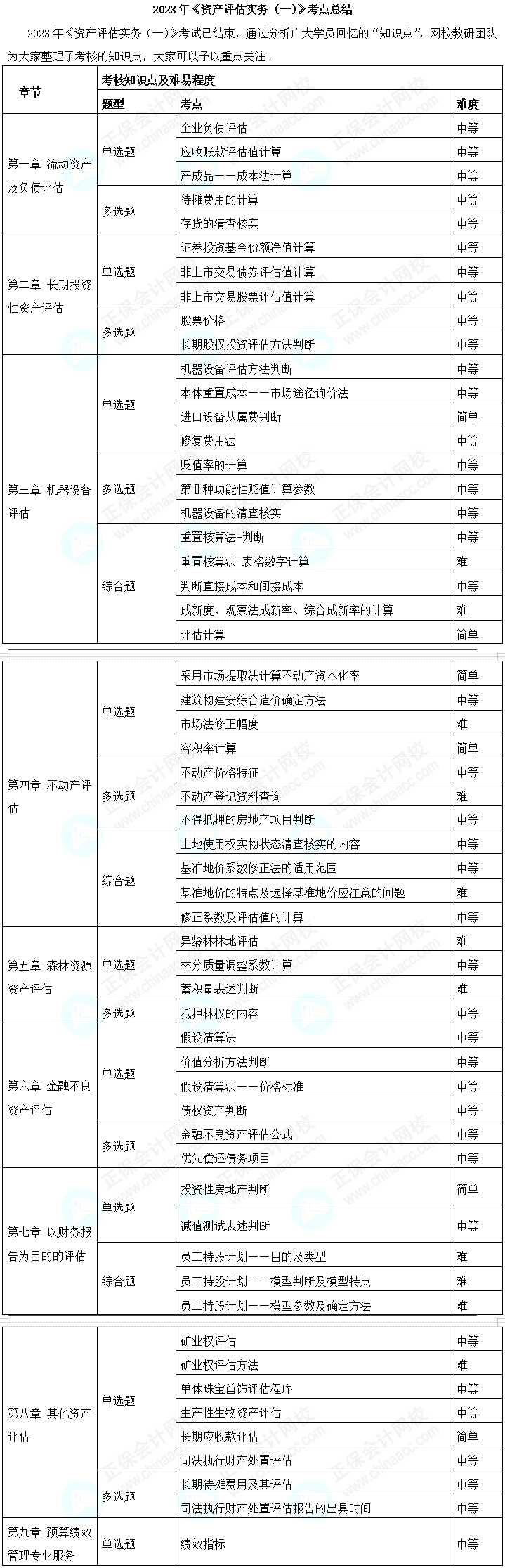 根据网校的学员反馈,正保会计网校教研团队梳理出了2023年资产评估师《资产评估实务一》考点总结,希望对广大考生有所帮助。