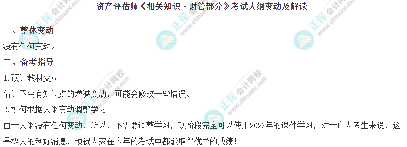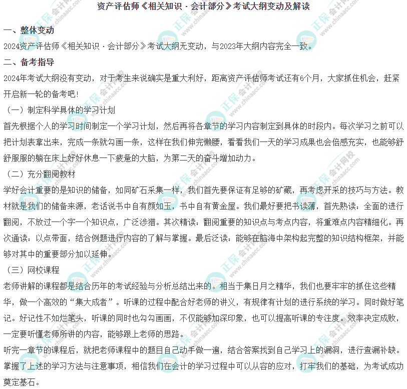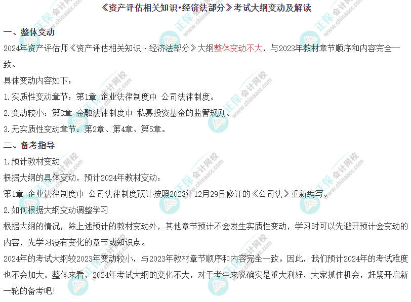 2024年资产评估师考试大纲已公布(点击查看大纲>)!2024年《资产评估相关知识》与2023年考试大纲变化大吗?别急!正保会计网校针对新旧考试大纲的变化进行了对比分析,让你轻松看懂变化!