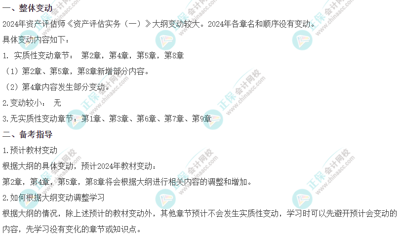 2024年资产评估师考试大纲已公布(点击查看大纲>)!2024年《资产评估实务一》与2023年考试大纲变化大吗?别急!正保会计网校针对新旧考试大纲的变化进行了对比分析,让你轻松看懂变化!