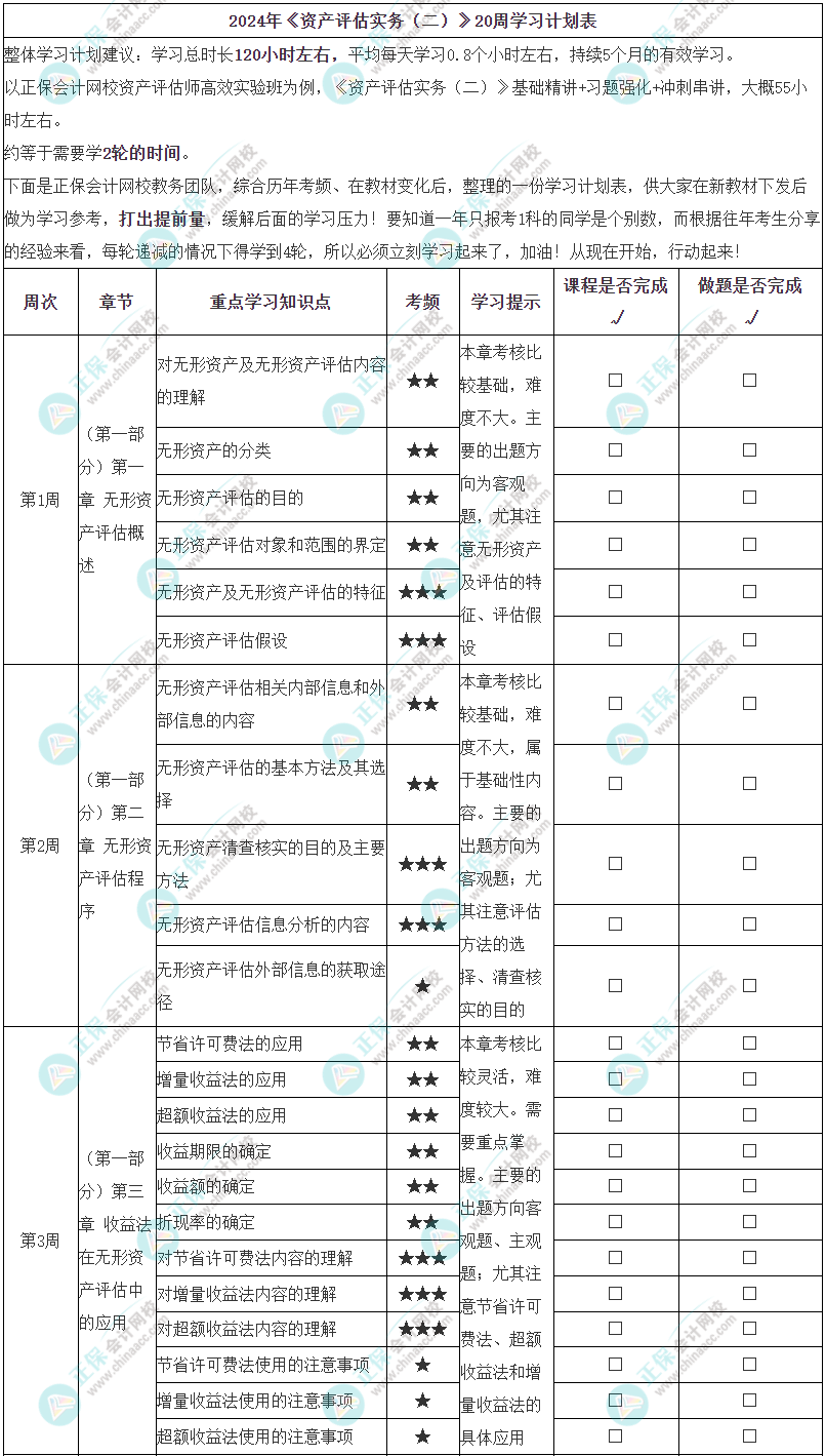 2024年资产评估师考试教材发布后,相信很多考生已经投入到学习当中。为了能让大家科学有效的进行备考,正保会计网校教研团队特为大家整理了《资产评估实务二》基础阶段学习计划打卡表!帮你安排的明明白白,让你备考学习不掉队!