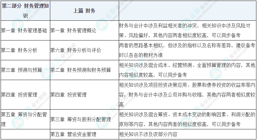 从上表可以看出,财管知识与财务与会计有一定的相似性。总体来看,财务与会计涵盖内容更多、跨越领域更广。即便是内容相似的几个章节,财务与会计也比财管知识更广。