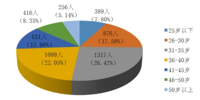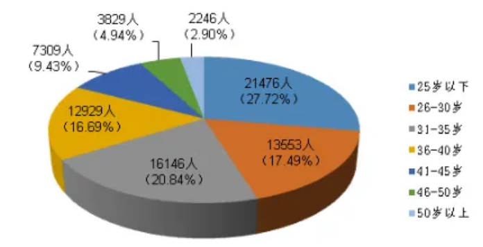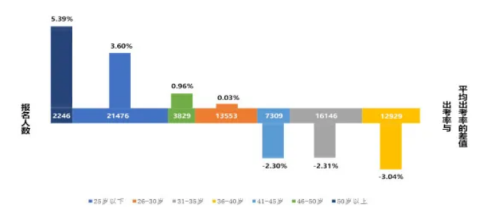 从报名考生的年龄看,考生年龄主要集中在25岁以下。随着年龄增加,报考人数整体呈下降趋势。