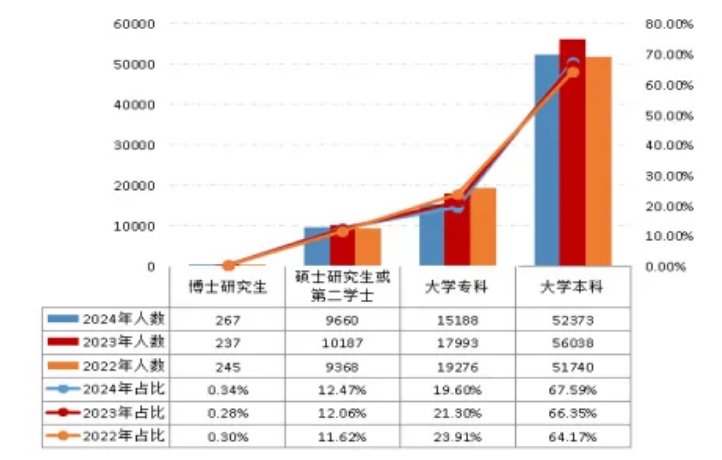 图5 2022年至2024年各学历报考人数对比统计图