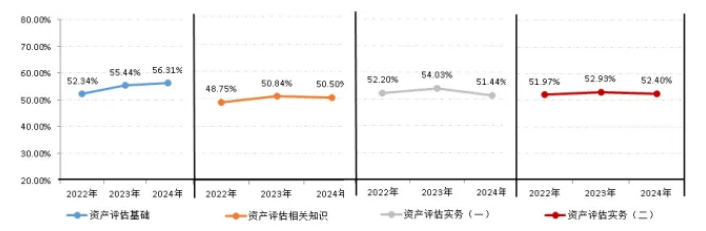 参考率最高的科目是《资产评估基础》,为56.31%;最低的科目是《资产评估相关知识》,为50.50%。资产评估基础科目2022年至2024年参考率逐年递增,其他科目参考率基本持平。