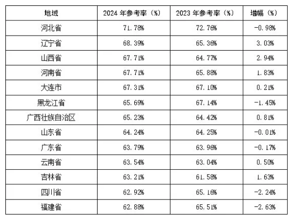 从各省市区的参考情况看,13个省市区高于全国参考率。河北省参考率最高,为71.78%。