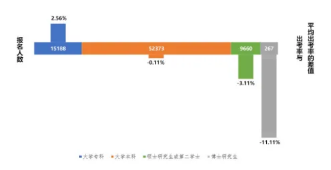 从参考考生学历情况看,专科学历考生参考意愿最高,本科以上学历考生随着学历等级的提高,参考率呈下降趋势。