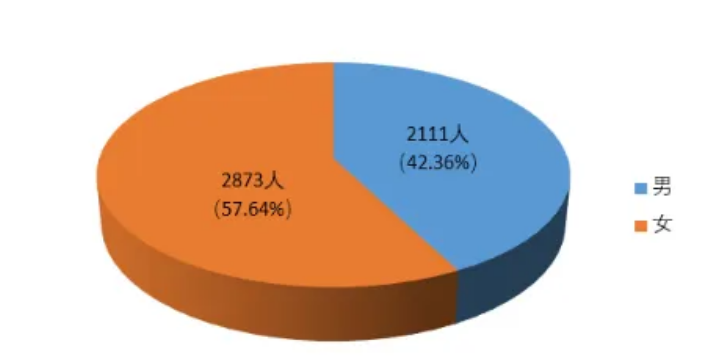 从性别看,全科合格人员中,女性2873人,占比57.64%,高于男性比例。合格考生中,女性比例逐年提高。