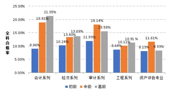 从考生专业技术职称等级情况看,总体上考生专业技术职称类别的等级越高,全科合格率越高。资产评估师考试在一定程度上体现了考生的职业技能。