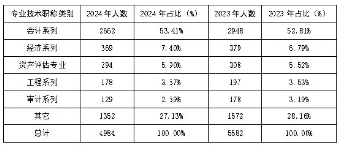 2024年不同专业技术职称类别中,会计系列考生全科合格人数占比最高。相较于2023年,会计系列、经济系列专业技术职业类别全科合格考生占比呈上升趋势,资产评估系列、工程系列、审计系列技术职业类别全科合格考生占比基本保持平稳。