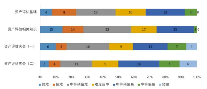 各科目中,《资产评估实务(二)》科目最容易,难度系数为0.49,《资产评估相关知识》科目最难,难度系数为0.41。