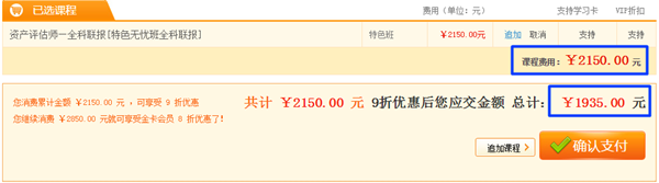 初次来到网校,正小保计划报名资产评估师特色无忧班全科联报辅导课程,总价值2150元,正小保因为具有了银卡会员资质,享受到了9折优惠,折后价格竟然只有1935元,便宜二百多块呢好不好!