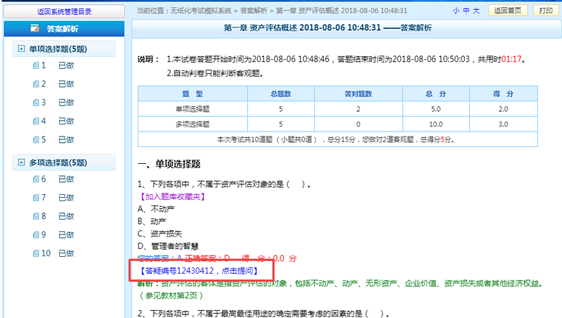 交卷后,系统自动为客观题打分,并提供整套试卷的详细解答,如果有不懂的问题还可以针对每一道试题进行提问。