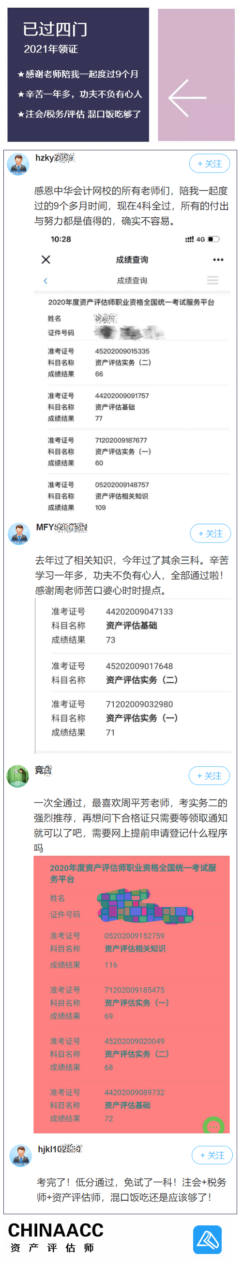 2020年资产评估师考试结束后,考生们在资产评估师圈子里纷纷晒出成绩单,并表白老师,像及了获奖人员的获奖感言!2021年,去演绎你的出圈名场面!
