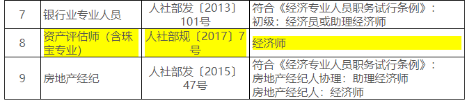 8 | 资产评估师(含珠宝专业) | 人社部规〔2017〕7号 | 经济师 | ||