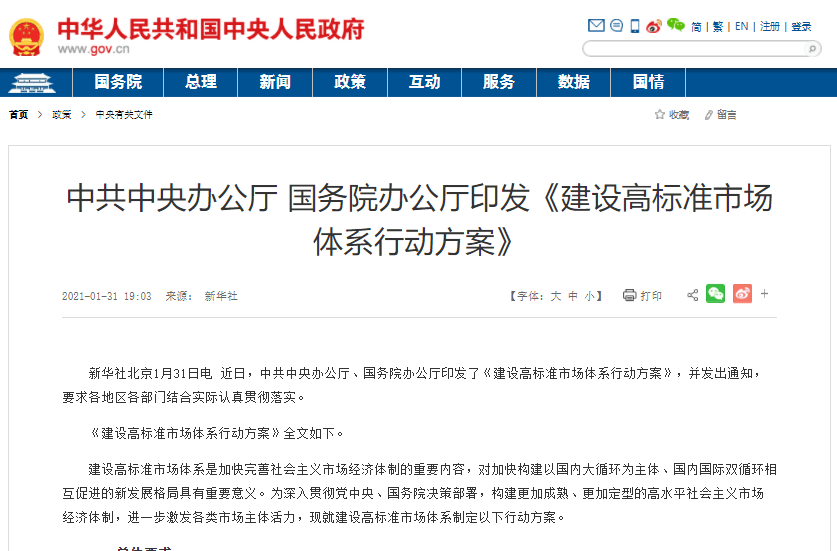 据2021年1月31日北京新华社消息,近日,中共中央办公厅、国务院办公厅印发了《建设高标准市场体系行动方案》,要求“通过5年左右的努力,基本建成统一开放、竞争有序、制度完备、治理完善的高标准市场体系。”