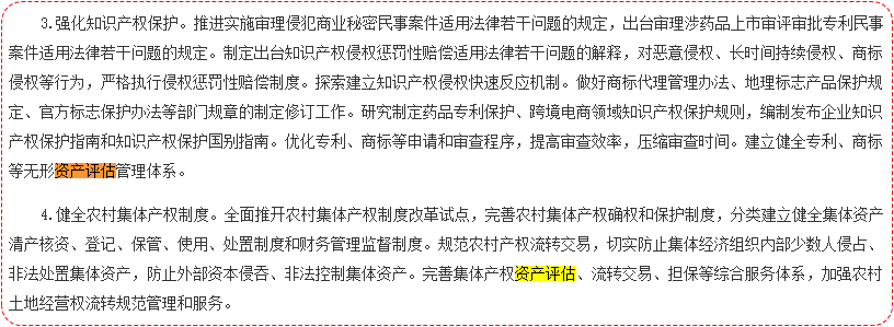 文中已明确提到“建立健全专利、商标等无形资产评估管理体系。”“完善集体产权资产评估、流转交易、担保等综合服务体系,加强农村土地经营权流转规范管理和服务。”