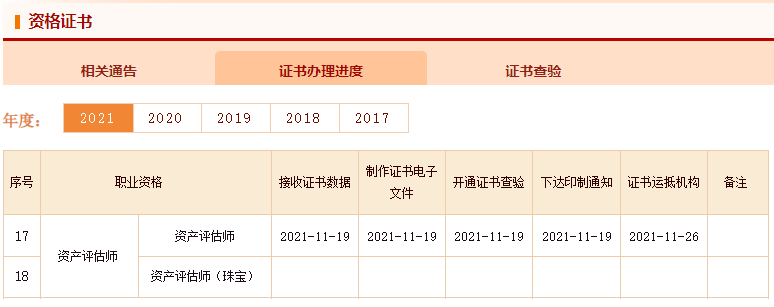 在中国人事考试网官方网站上,资格证书-证书办理进度表中显示资产评估师合格证书已于1月17日下达印制通知,也就是说证书印制中,印制完成就发往各地评协了~