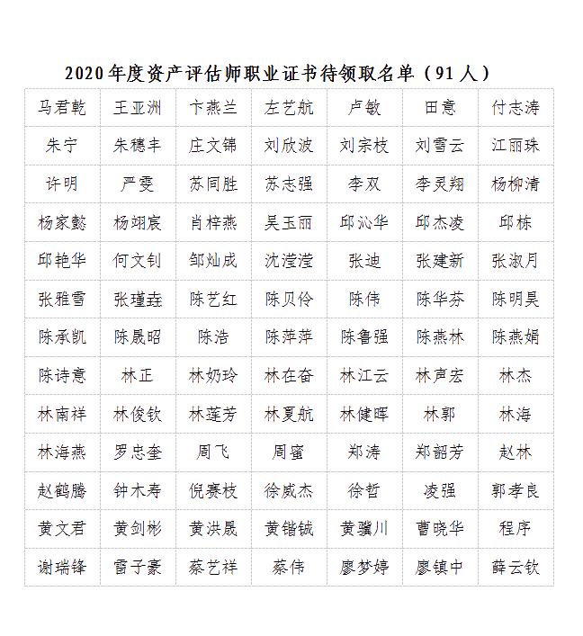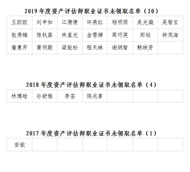 (一)协会现还保存部分2017年度、2018年度和2019年度考试通过资产评估职业资格证书,请还未领取人员尽快到协会领取。