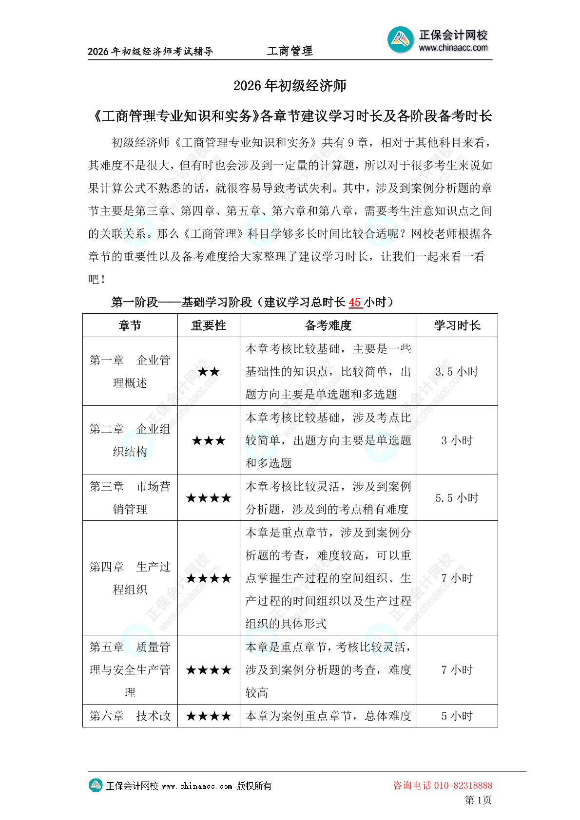 2026初级经济师《工商管理》各章节建议学习时长以及各阶段备考时长