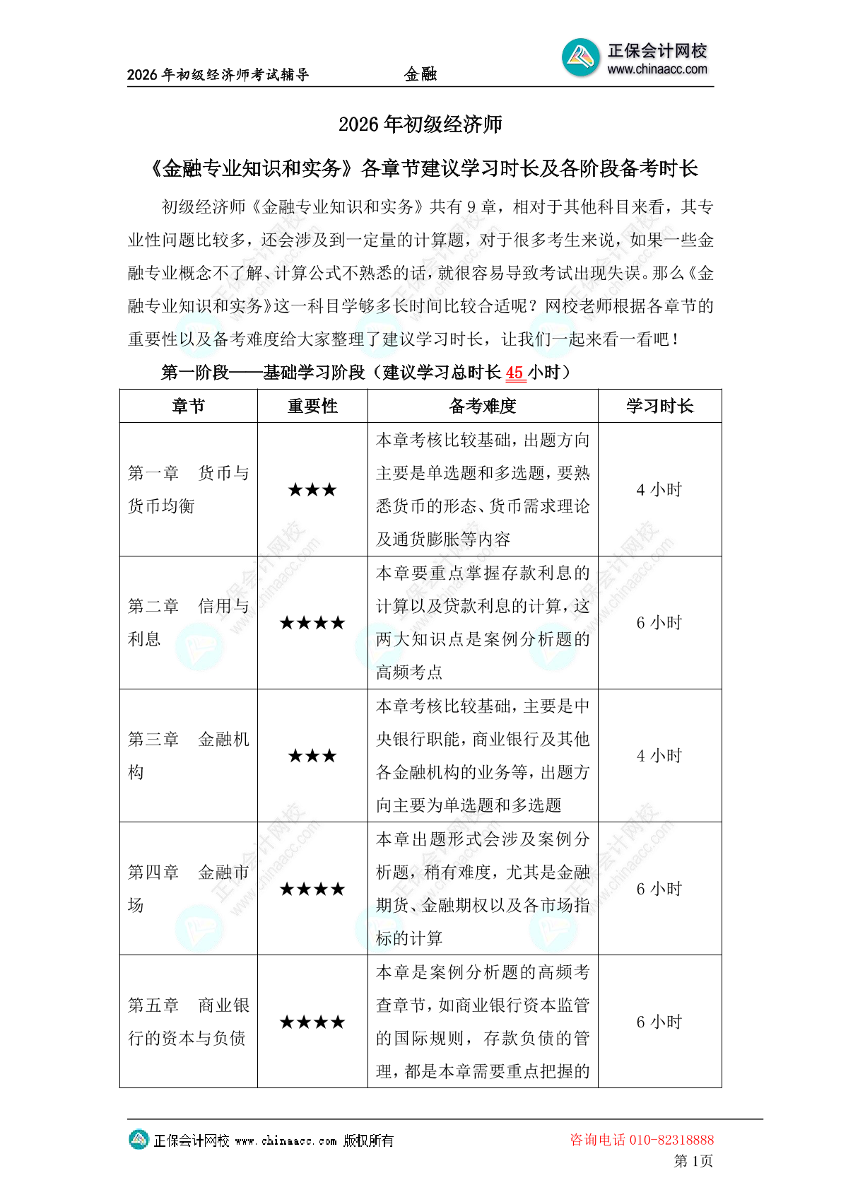 2026初级经济师《金融》各章节建议学习时长以及各阶段备考时长