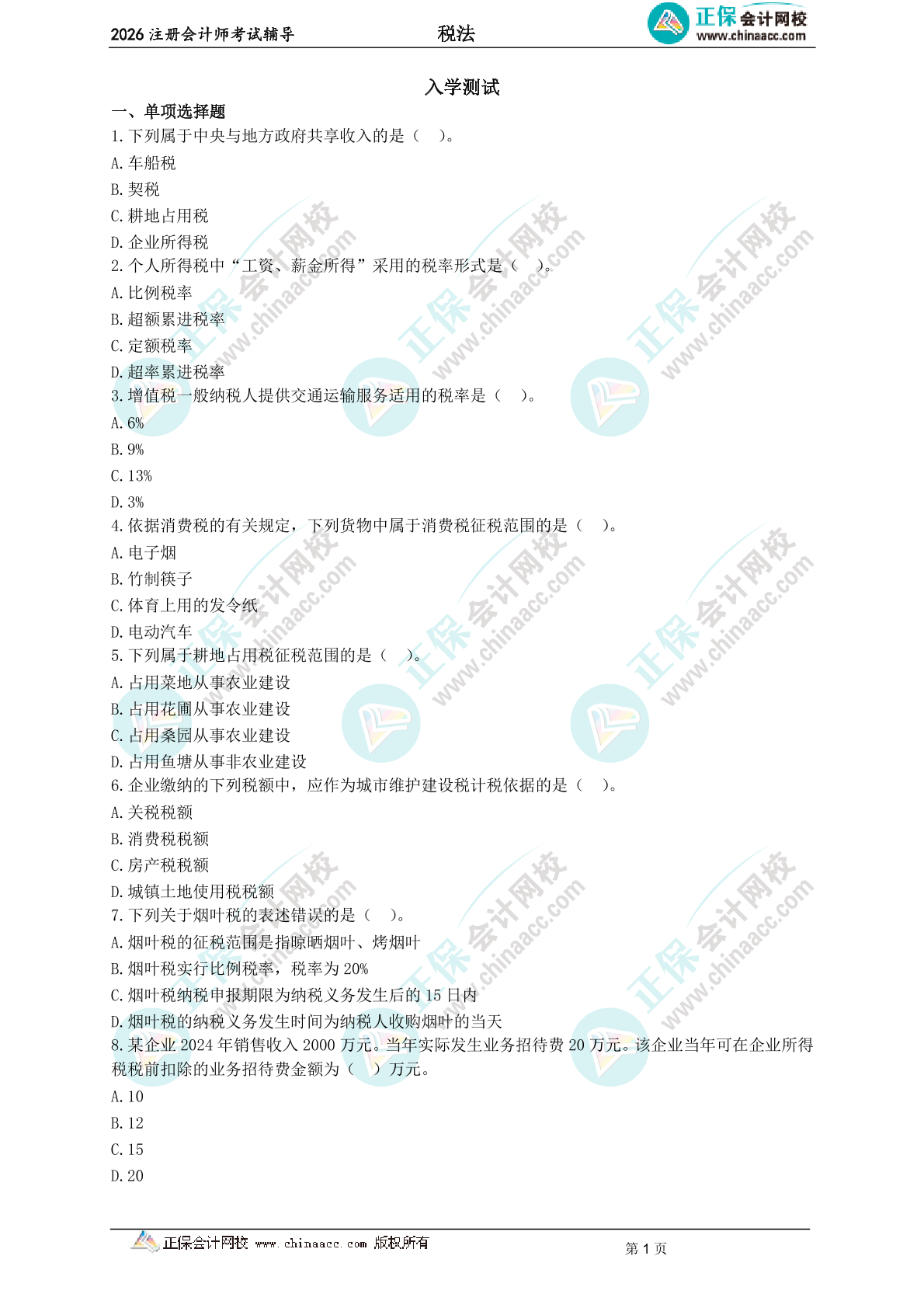 2026年注册会计师《会计》入学测试卷