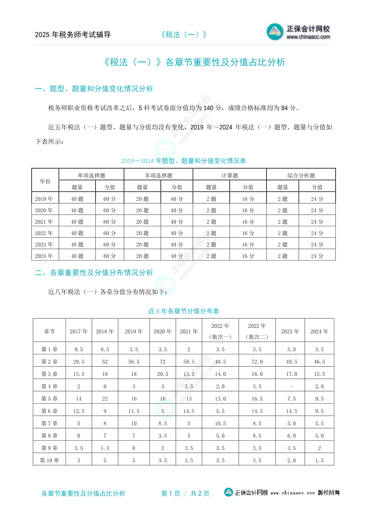 2025年《税法(二)》各章节重要性及分值占比分析