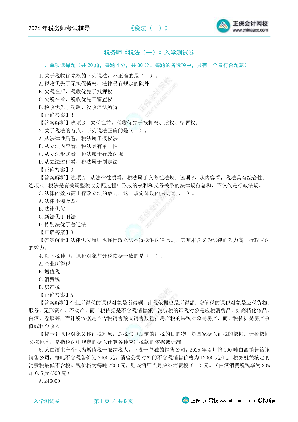 2026年税务师《税法(二)》入学测试