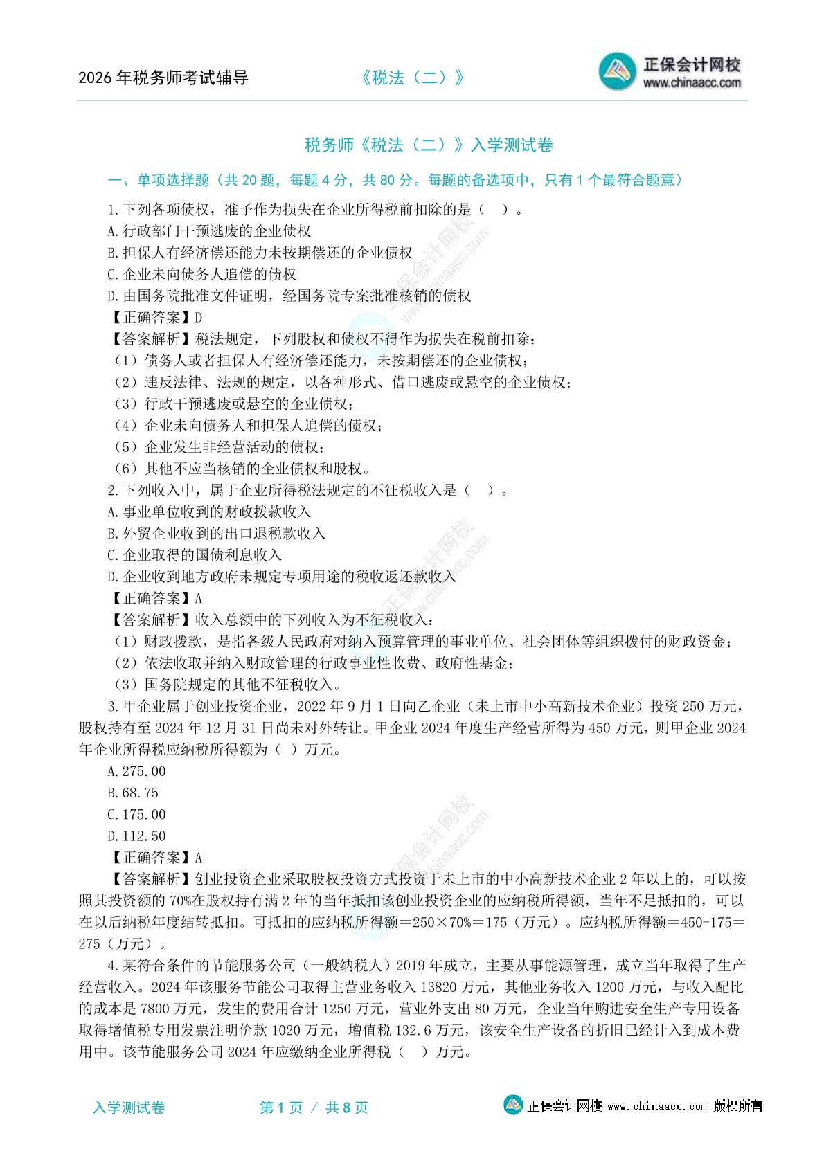 2026年税务师《税法(一)》入学测试