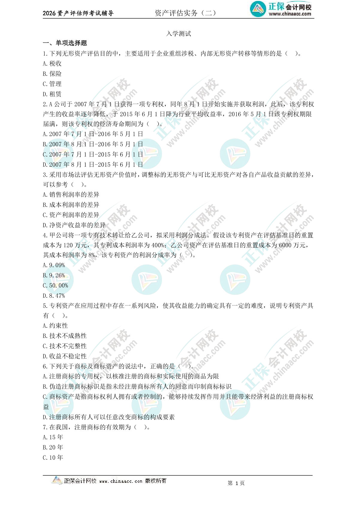 2026年资产评估师《资产评估实务二》入学测试卷