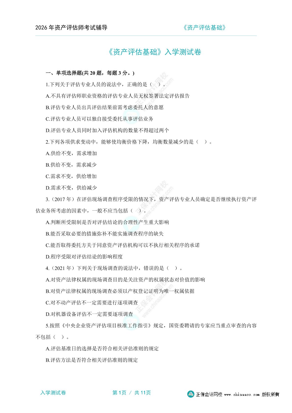 2026年资产评估师《资产评估基础》入学测试卷