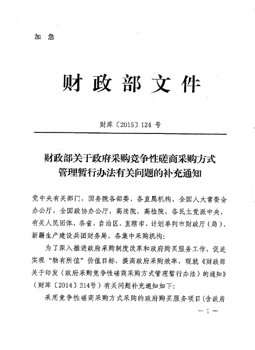 现将《财政部关于政府采购竞争性磋商采购方式管理暂行办法有关问题的补充通知》(财库[2015]124号)转发给你们,请遵照执行。