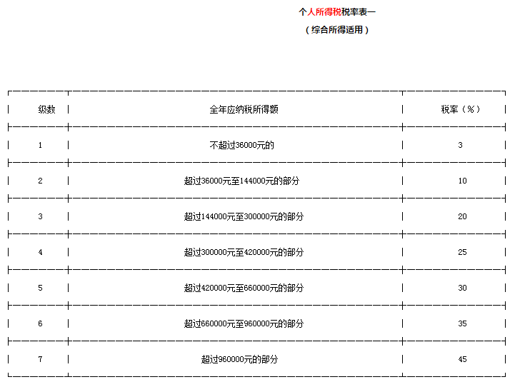 (一)综合所得,适用百分之三至百分之四十五的超额累进税率(税率表附后);